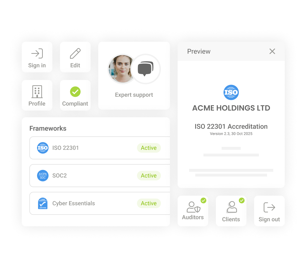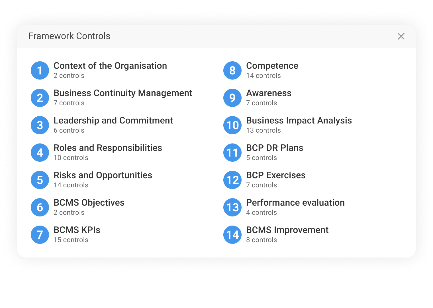 Achieve ISO 22301 Business Continuity Management System (BCMS) certification quickly and efficiently — demonstrate to customers, regulators, and partners your ability to maintain operations and recover quickly from disruptions.