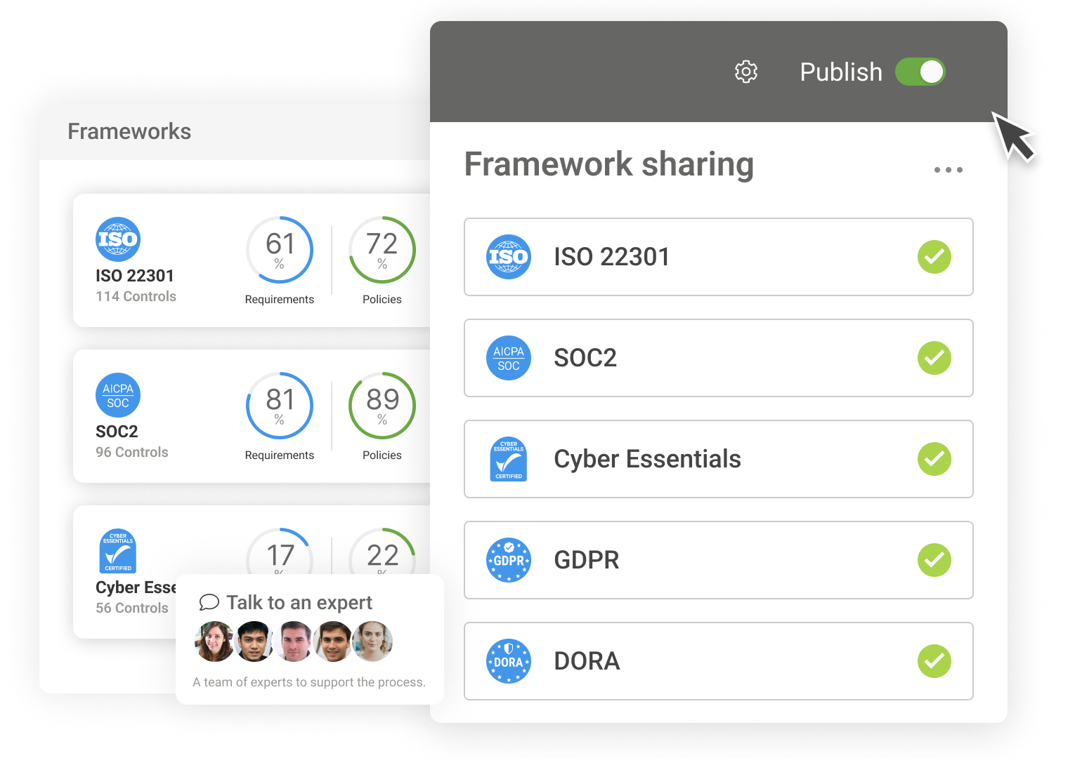 Manage ISO 22301 and other certifications in a single platform. Our cross-framework task mapping reuses evidence and actions across standards, making compliance faster, easier, and far more efficient.